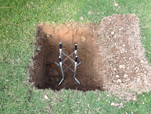 Cách lắp đặt này có phần chắc chắn hơn cách lắp đặt phía trên. Trước hết, đào một hố sâu 50 x 50 x 50 cm rồi đặt kế cấu bu lông xuống hố. Sau đó lấp đầy hố bằng bê tông, tuy nhiên phải chừa phần nắp chân thiết bị và phần bắp vít lại.